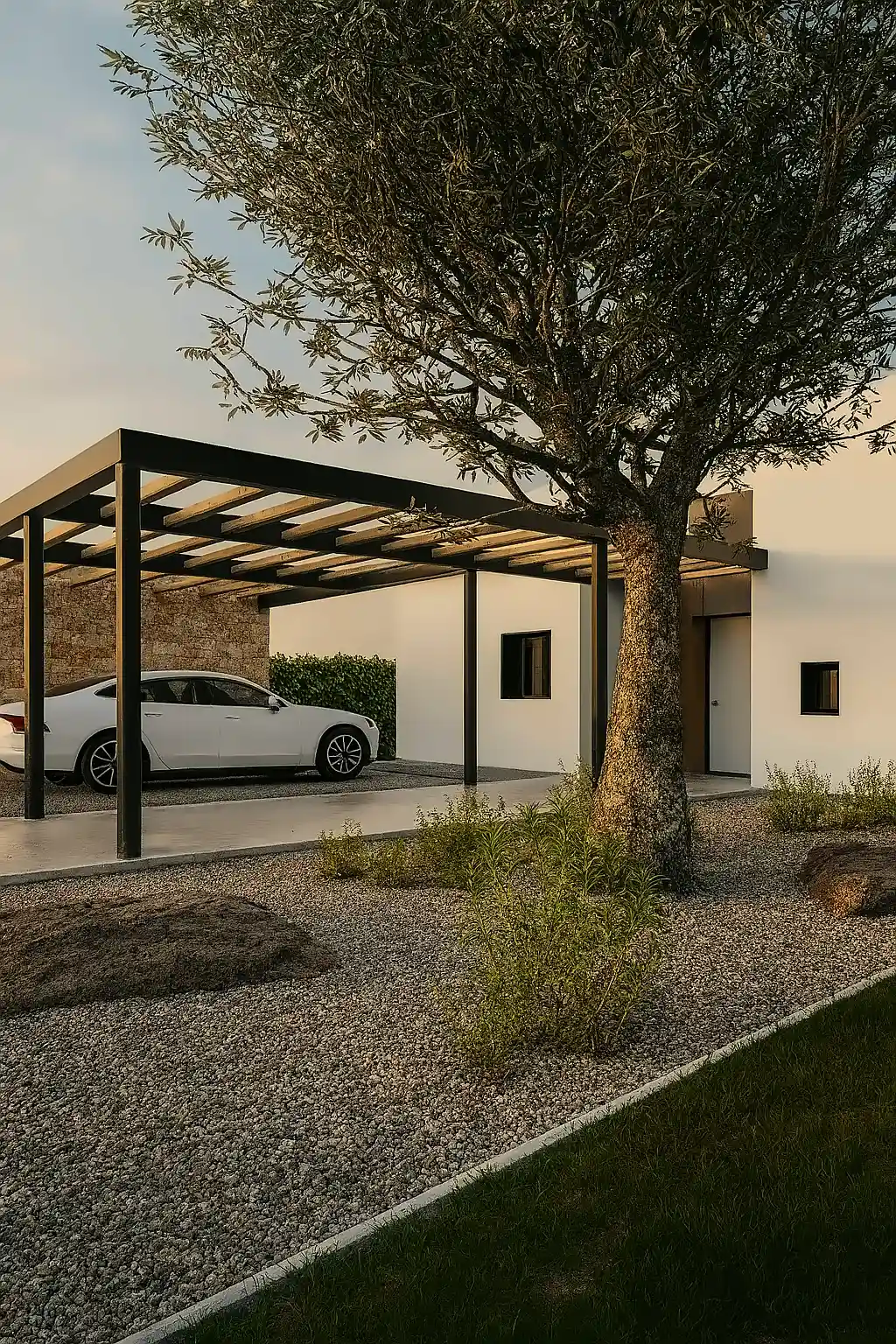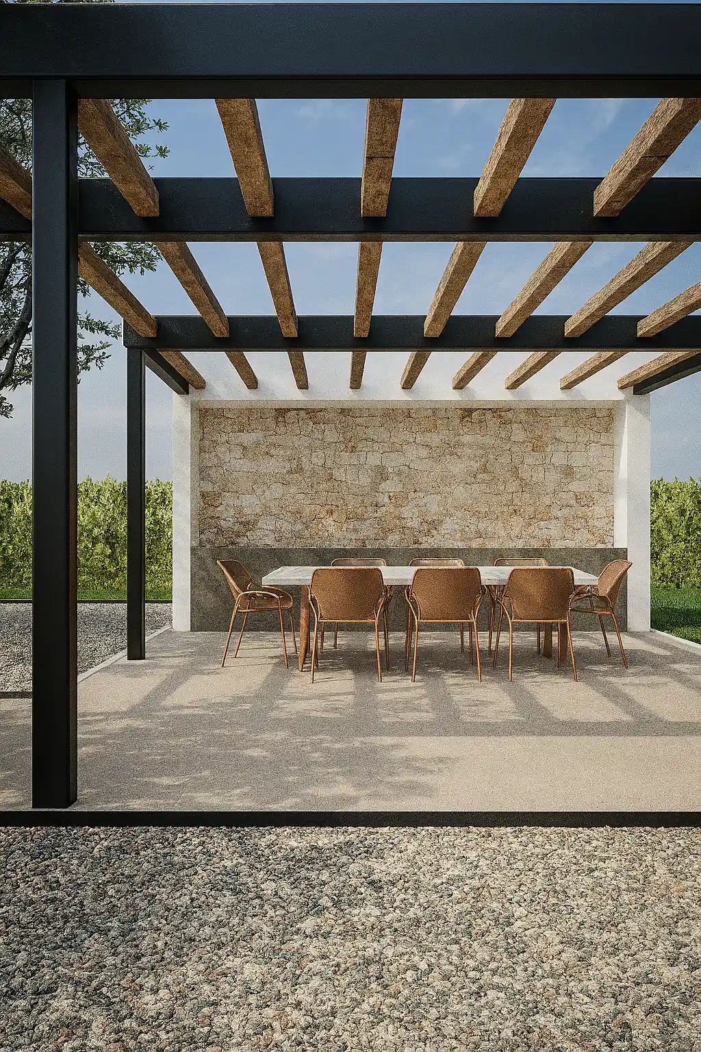 Los tres volúmenes principales se conectan mediante una pérgola lineal que surge en el lado oeste de la vivienda, sirviendo de transición entre el exterior y el interior. Esta estructura continúa a lo largo de la fachada sur, integrando visual y funcionalmente los volúmenes y proporcionando sombra a los espacios exteriores. Al final de este recorrido, la pérgola culmina en la zona de la barbacoa, unificando el diseño de los espacios exteriores y proporcionando una sensación de cohesión.