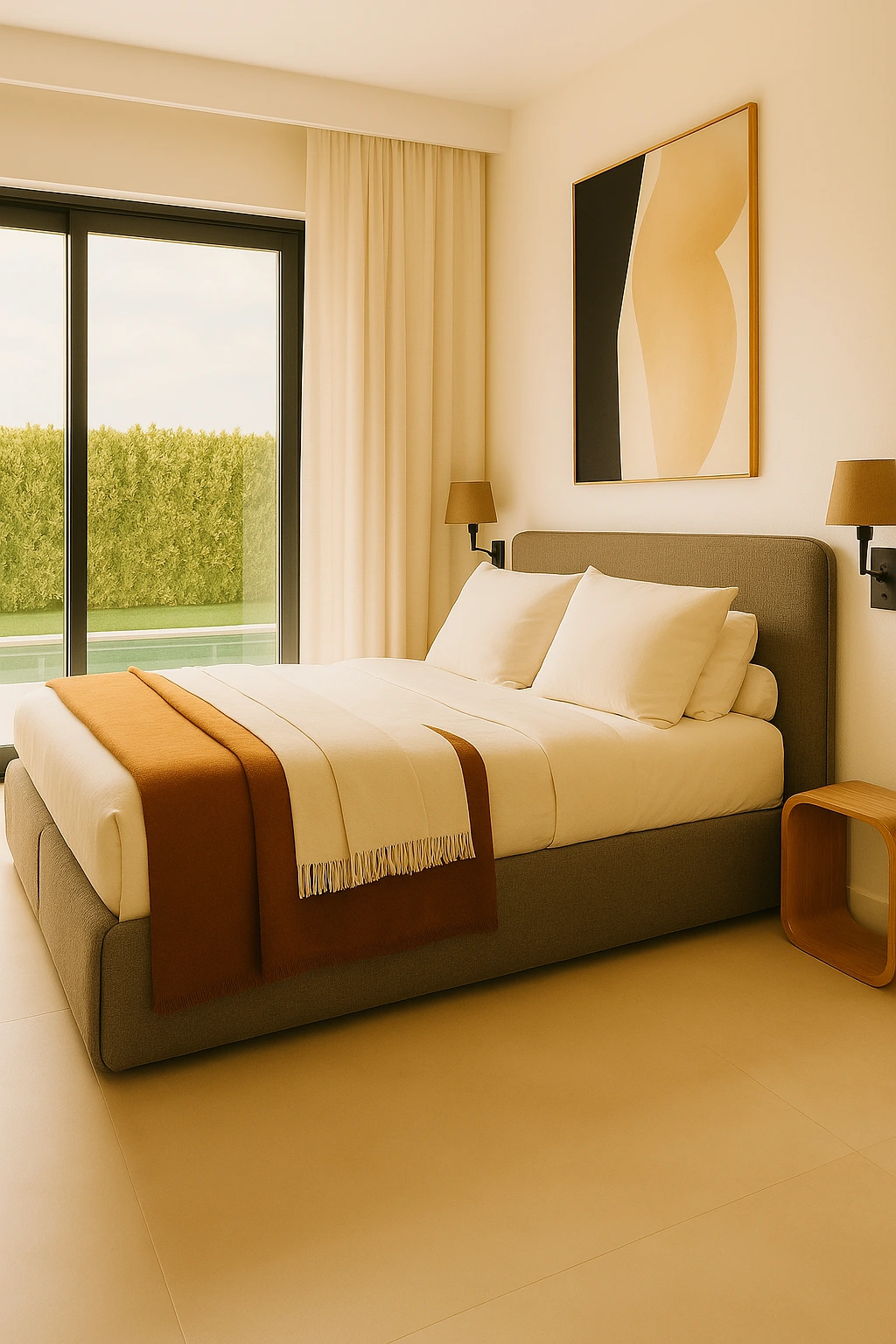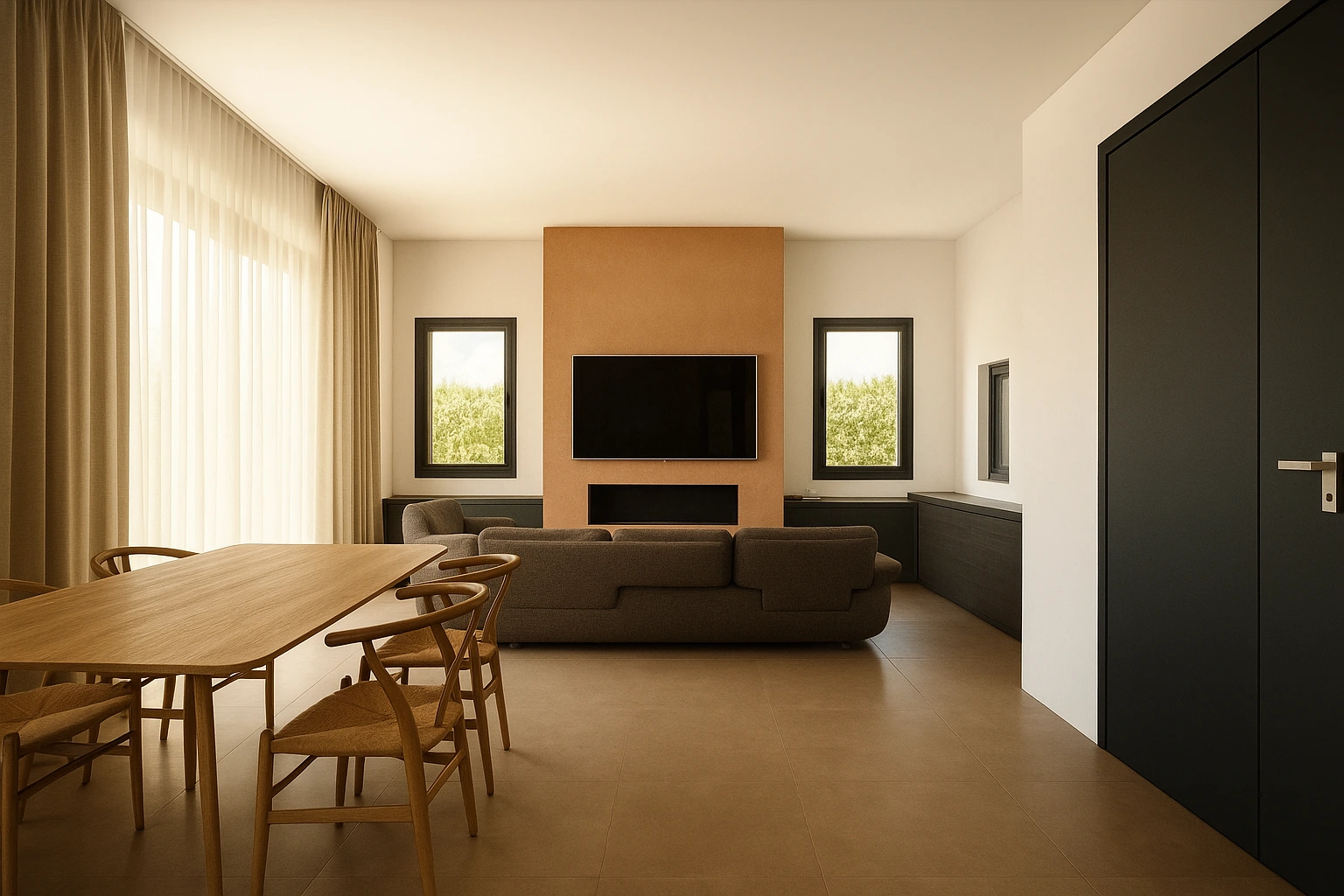 El estilo arquitectónico de CASA CG es contemporáneo, con una fuerte referencia a la tradición ibicenca. Los materiales locales, como la piedra y la madera, se emplean para reforzar la conexión con el entorno natural, aportando calidez y una textura auténtica a la edificación. La geometría simple de los volúmenes y la pureza de las líneas rectas se combinan con un diseño funcional, lo que da como resultado un espacio moderno, elegante y confortable.