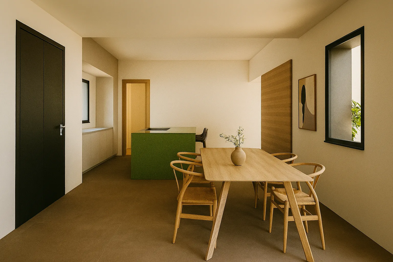 La planta baja se estructura en tres volúmenes claramente definidos. El primer volumen alberga el área social de la vivienda, compuesto por un salón-comedor-cocina de concepto abierto, que se convierte en el eje principal de la vida diaria. Este espacio está diseñado para potenciar la luminosidad y la circulación natural del aire, con una conexión directa con el exterior. Dentro de este mismo volumen se encuentran la lavandería y la despensa, que se vinculan funcionalmente con la cocina, proporcionando espacio adicional para almacenamiento y servicio.