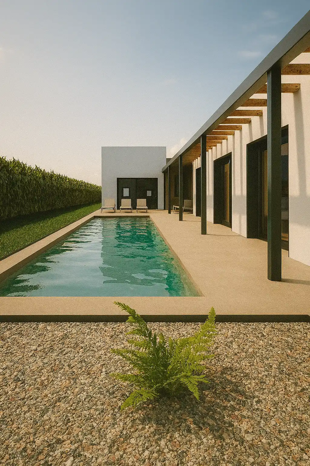 Un volumen adicional, anexado a la vivienda principal, alberga las instalaciones técnicas, un baño extra y una zona de barbacoa que da servicio a la piscina y la zona ajardinada. Este espacio complementa las áreas exteriores, proporcionando soporte funcional para el ocio y la relajación, al tiempo que mantiene la coherencia estética y arquitectónica del conjunto.